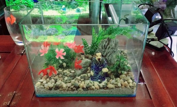 - Bể cá mini để bàn kích thước 26cm rộng 17cm cao 19cm đã bao gồm trang trí cây nhựa, đồ sứ.