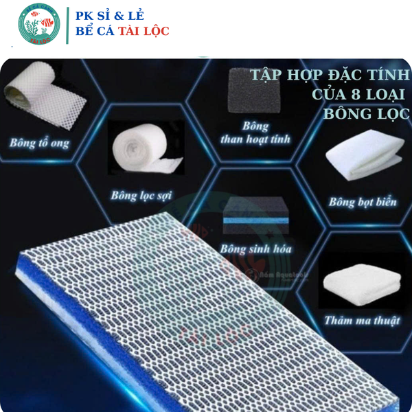 Bông lọc 8 lớp chuyên dụng cho bể cá cảnh, hồ thủy sinh, giúp lọc sạch cặn bẩn, thức ăn thừa, phân cá và các chất lơ lửng trong nước. Với thiết kế 8 lớp dày đặc, bông lọc cho hiệu quả vượt trội so với loại bông lọc thường, giữ nước luôn trong sạch, hạn chế rong rêu và mùi hôi.