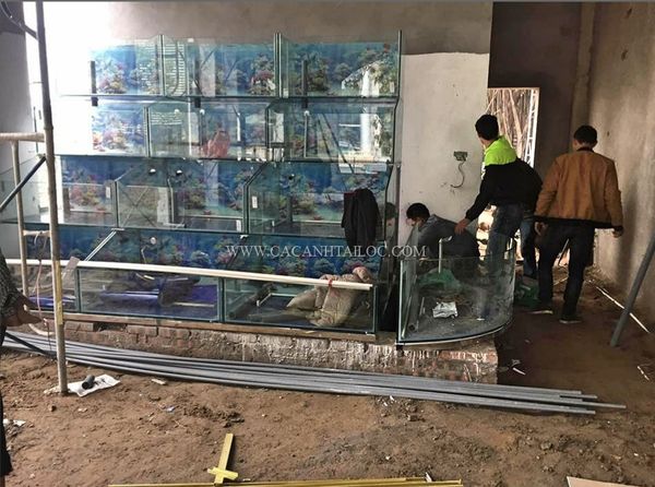 Dàn bể nuôi thủy hải sản được bể cá Tài Lộc thi công tại nhà khách Hùng Vương kích thước dài 3.8m rộng 1.8m cao 2.5m